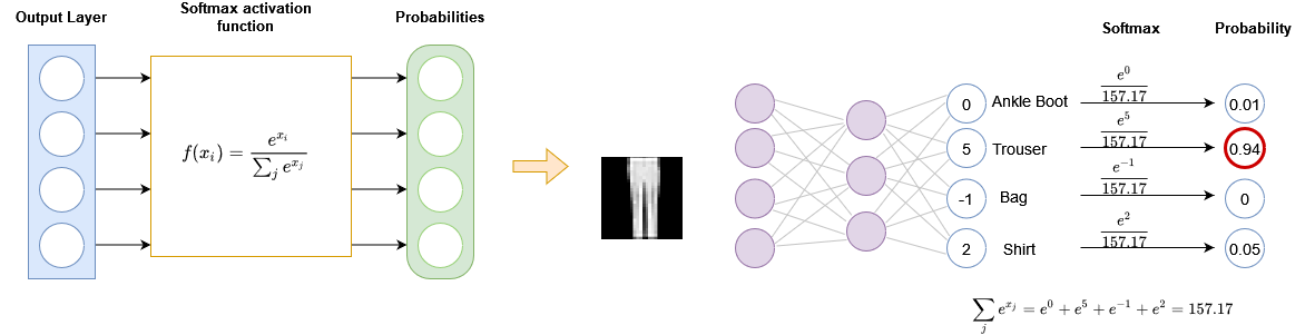 - 출력 점수를 확률로 변환하기 위해 다중 클래스 분류를 위한 신경망의 마지막 계층으로 자주 사용됨