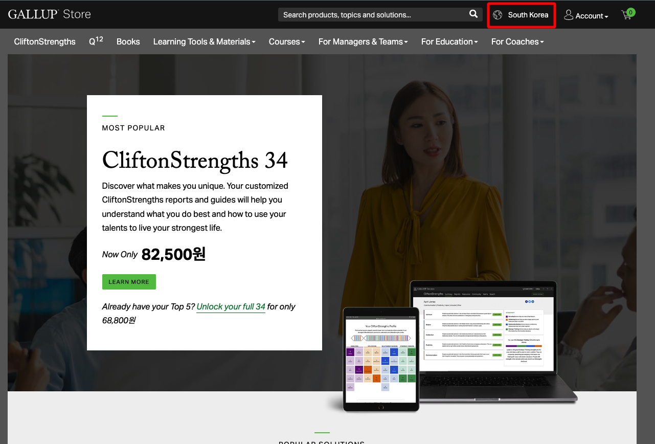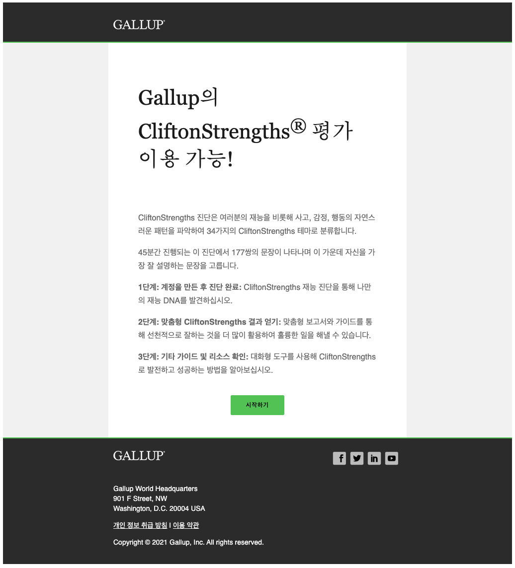 갤럽(Gallup)의 강점 진단(스트렝스 파인더, 클리프턴 스트렝스)을 진행하고자 하였다. 구글링을 해보았으나 비교적 최신 정보는 없었다. 그리고 생각보다 강점 진단 구매 및 진행 과정이 까다로웠는데 이를 공유하고자 한다. 그리고 두 번의 결제를 통해 알게 된 싸게 결제하는 방법을 공유하고자 한다.