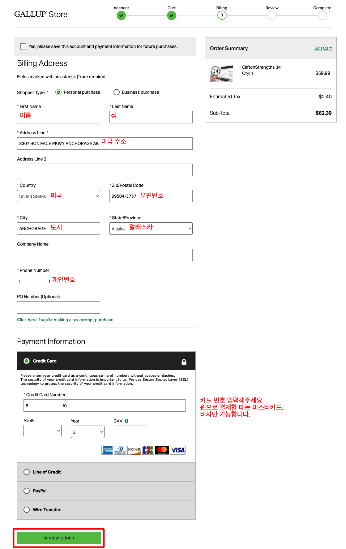 16. 필요한 내용을 입력하고 'REVIEW ORDER'을 누른다.