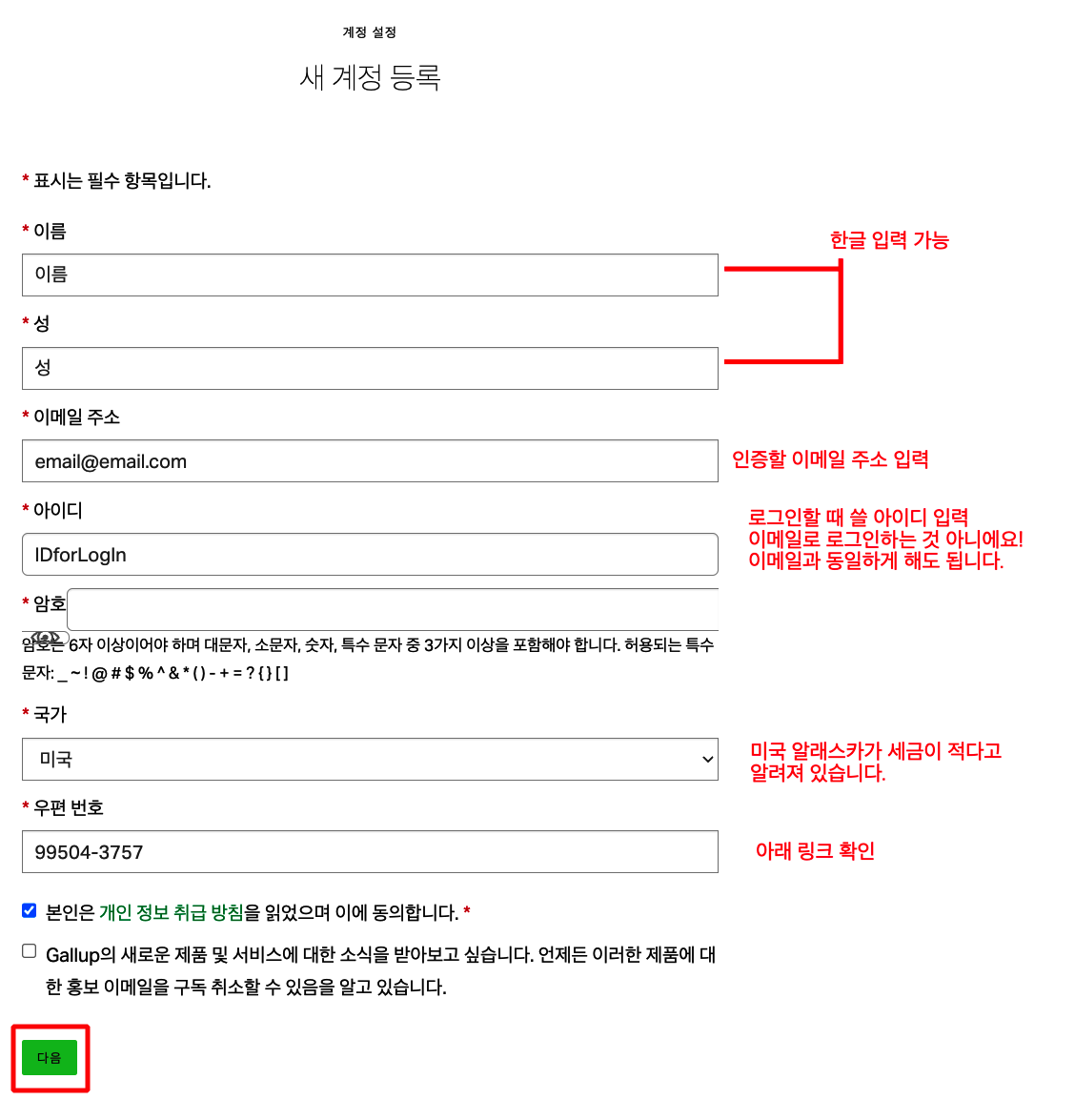 국가와 우편번호를 입력해야 하는데, 싸게 결제하려면 미국의 알래스카 주에 있는 주소를 사용하면 된다. 아래 링크에서 임의 주소를 얻을 수 있다. 결제할 때 다시 써야 하니 주소를 어딘가에 메모해두자.