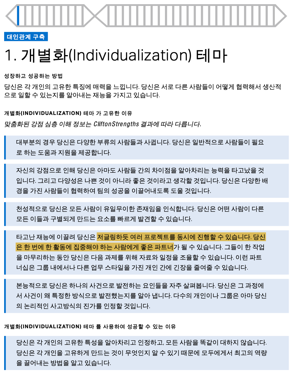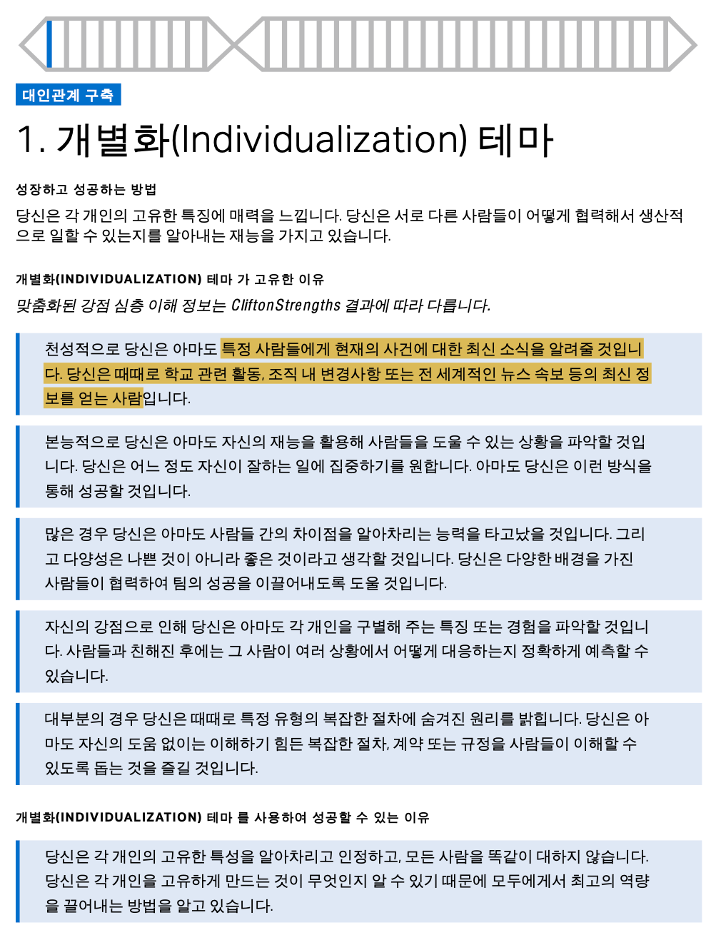 이렇게 갤럽의 클리프턴 스트렝스를 진행해보았다. 몇 년 전부터 지금까지 계속 MBTI가 유행을 타고 있지만, 우리 모두 경험적으로 신뢰도가 부족하다는 것을 알 수 있다. 오히려 필자는 해당 검사 결과에 자신을 맞추려는 사람들을 많이 보았다. 반면, 갤럽 강점 진단은 비싸다고 생각할 수 있지만 충분히 자신을 객관적으로 판단해서 맞춤형으로 분석해줄 수 있는 테스트라고 생각이 된다. 다음 글에는 강점이 단점이 되는 경우, 클리프턴 스트렝스에서 바라보는 강점과 약점의 의미, 검사 결과지 분석 방법에 대해 설명할 것이다.