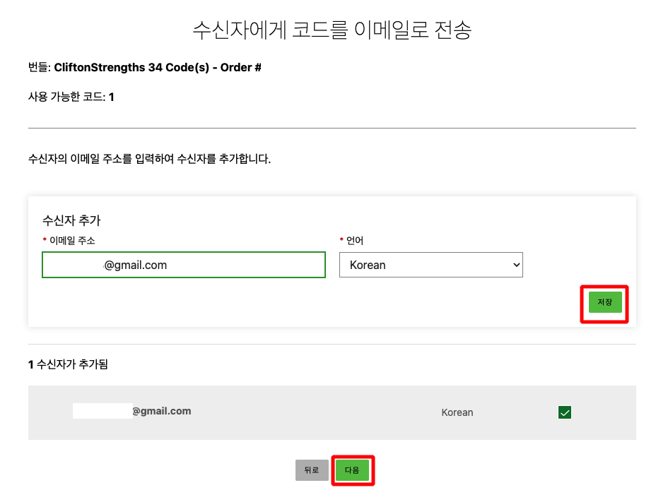 저장을 누르면 아래에 수신자가 추가된 것을 확인할 수 있다. 본인은 타인에게도 보내보았고, 테스트를 잘 진행할 수 있는 것을 확인하였다.