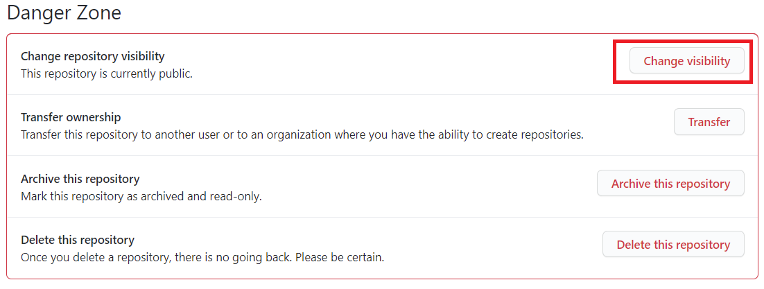 2. 'Options' 하단의 'Danger Zone'에서 'Change visibility'를 누른다.
