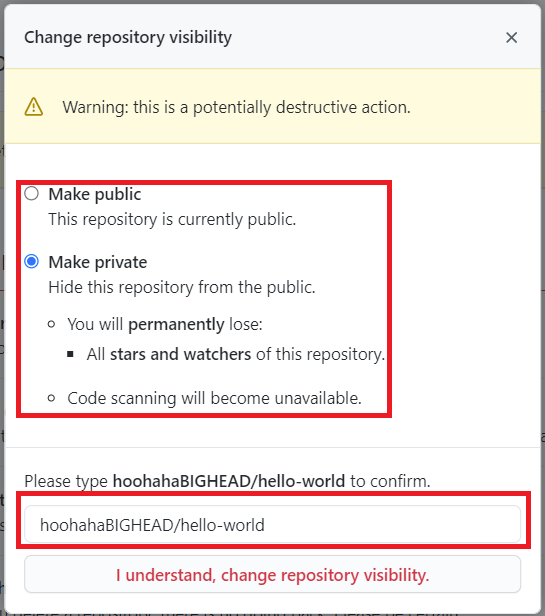 public에서 private로 바꾸면 그동안 생긴 star와 watchers가 모두 사라지고 코드 스캔을 할 수 없다고 한다. 각자 상황에 맞게 확인하자. 아래에 본인의 계정 이름과 repository의 이름을 작성하고 버튼을 누르면 모든 과정이 끝난다.