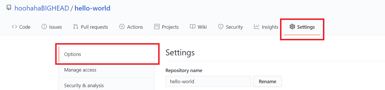 1. 바꾸고자 하는 repository에서 'Settings'의 'Options'에 들어간다.