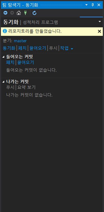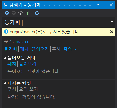 '푸시'를 누르면 아래의 작업화면과 함께 푸시되었다고 나온다.