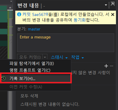 '변경 내용'의 '작업'에서 '기록 보기'를 누르면 commit 기록을 볼 수 있다.