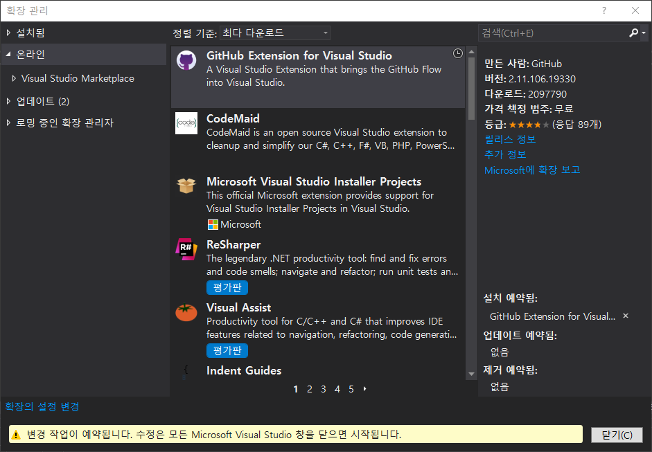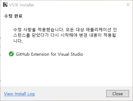 이렇게 설치 작업이 진행되고 설치가 완료되었다고 나온다. Visual Studio를 재실행해주자.