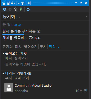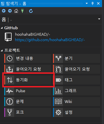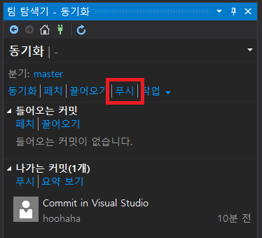 4. push를 하기 위해 '동기화'를 누르고 '푸시'를 누른다.