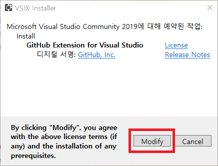 Visual Studio를 끄면 아래와 같은 화면이 나온다. Modify를 눌러주자.
