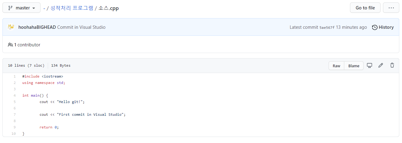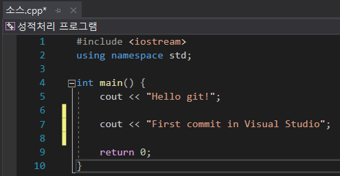 이때 변경된 '소스.cpp' 파일을 눌러보면 아래와 같이 변경된 사항이 나온다. 수정된 것을 확인하자.