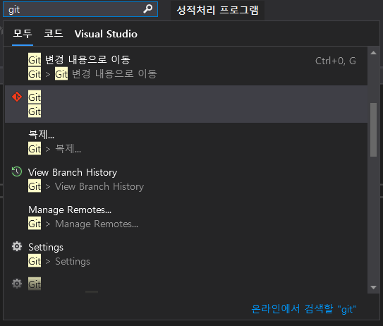 1.2. '검색'에서 'git'를 입력하고 'Git'을 찾아 실행시킨다.(단축키 Ctrl+Q)