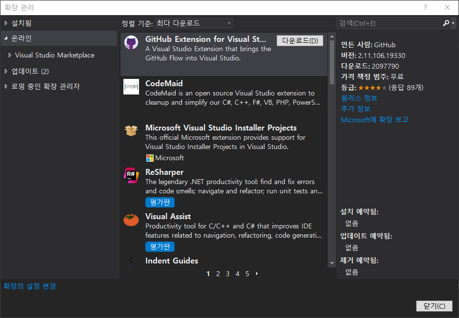 2. 'GitHub Extension for Visual Studio'를 다운로드한다.