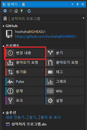 2. 오른쪽의 '팀 탐색기'에서 '변경 내용'을 누른다.