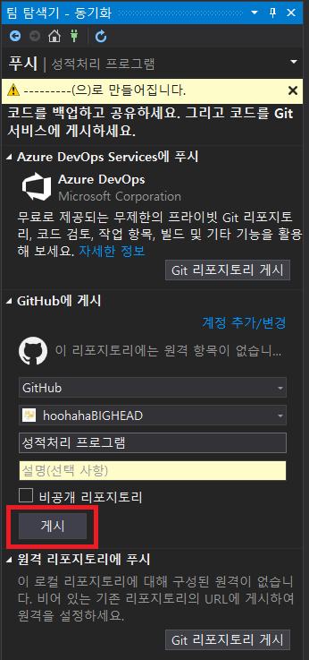 이렇게 Visual Studio에서 Github로 프로젝트를 올렸다. 이제는 코드를 변경하고 업로드해보자.