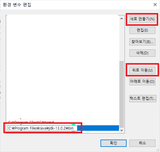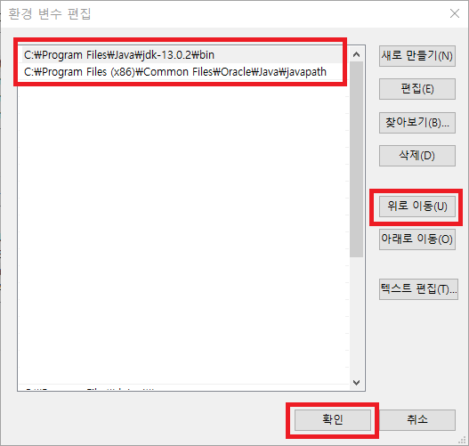 7. '위로 이동'을 클릭해 환경변수를 'Oracle' 위에 위치시키고 확인을 누른다.
