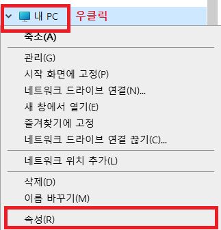 1. '내 PC' >> '속성(R)'을 클릭한다.