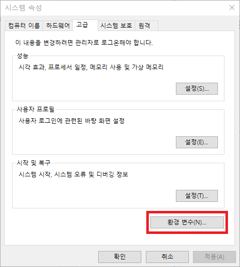 3. '고급' 탭의 '환경 변수(N)...'을 클릭한다.