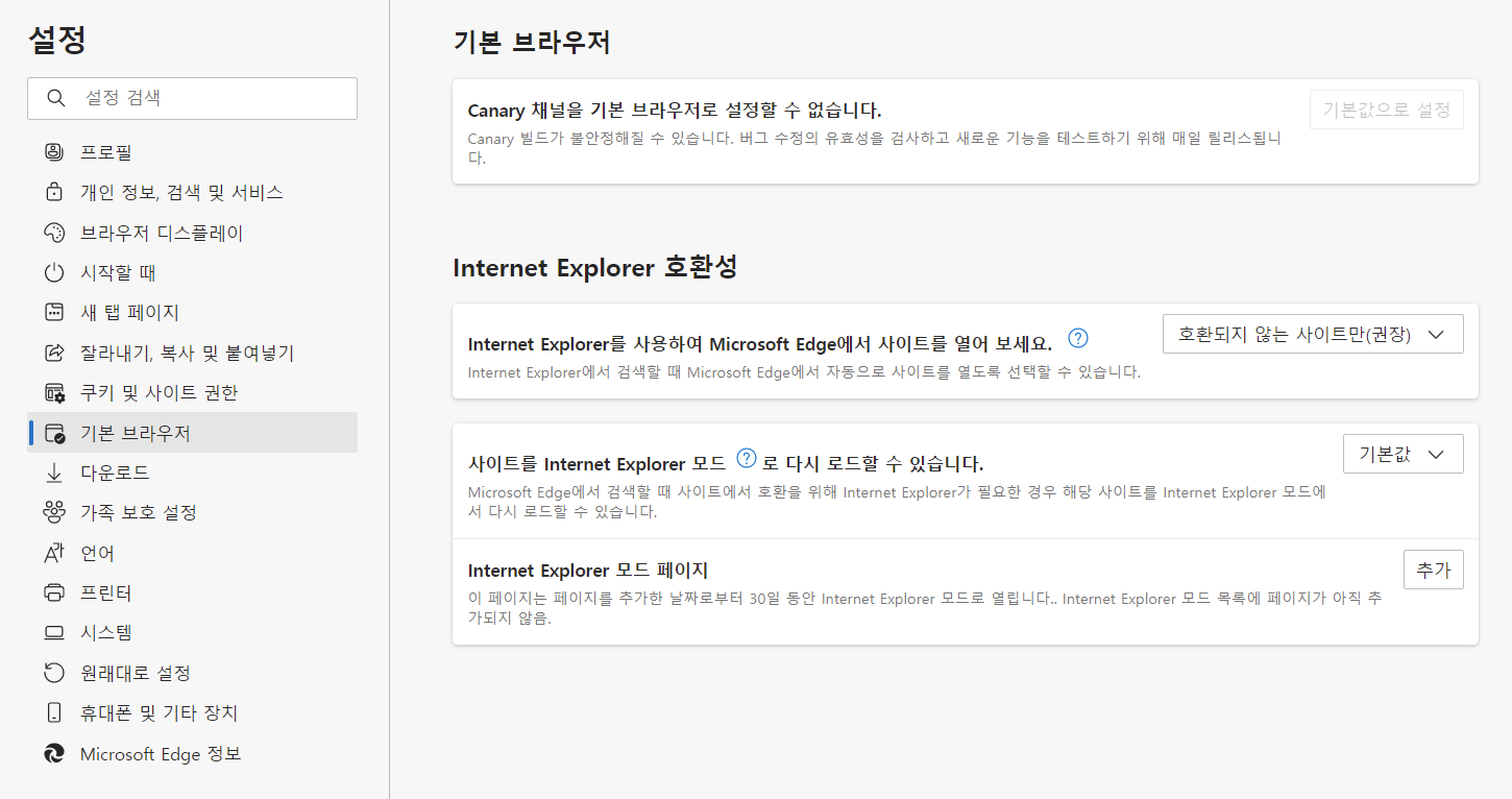 canary 버전은 쉽게 말해 개발자용 미리보기 버전이라고 생각하면 된다. 현재 윈도우에 기본적으로 설치된 버전은 stable 버전이라 ActiveX 지원 기능이 있었다가 사라졌다. 어쩔 수 없다.. 다운로드 링크는 아래에 있다.