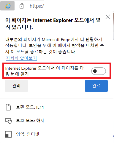 만약 해당 페이지를 무조건 'Internet Explorer' 모드로 접속해야 한다면 아래의 빨간 박스 내의 버튼을 누르면 자동으로 해당 모드로 접속해준다.
