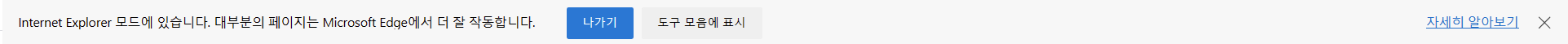 위 버튼을 누르면 아래와 같이 Internet Explorer 모드에 있다는 메시지와 알림창이 나오며 사이트가 제대로 로드된 것을 확인할 수 있다.