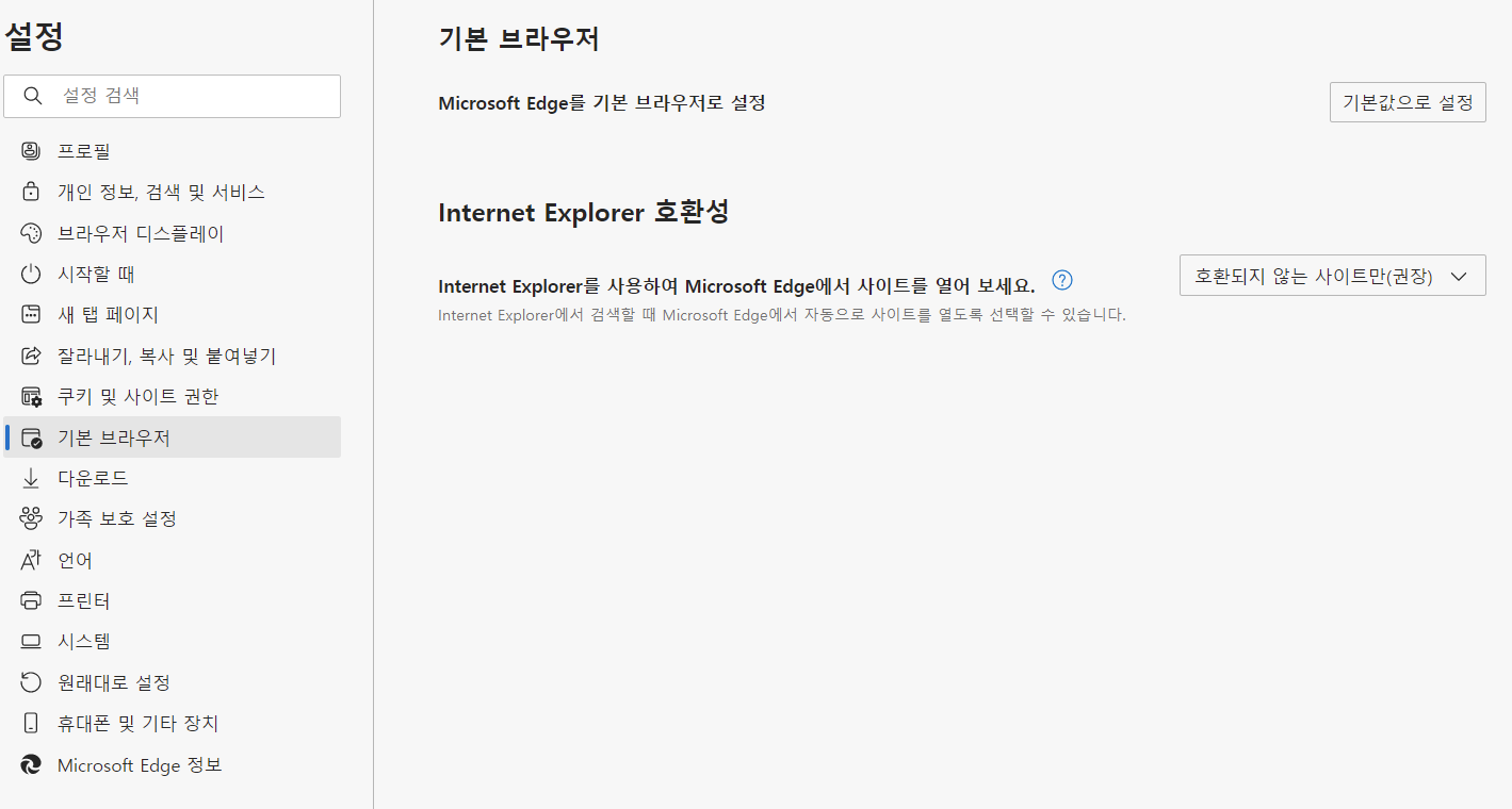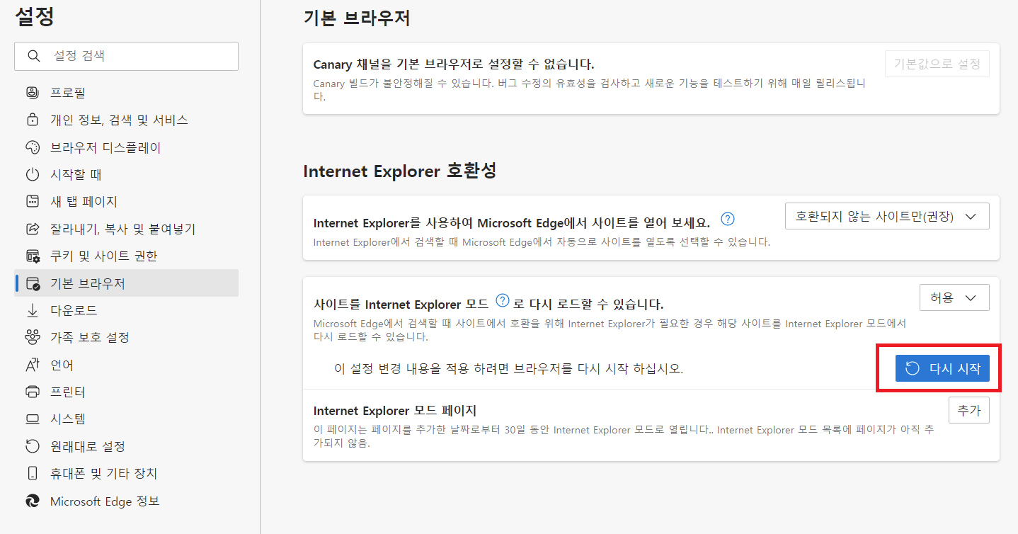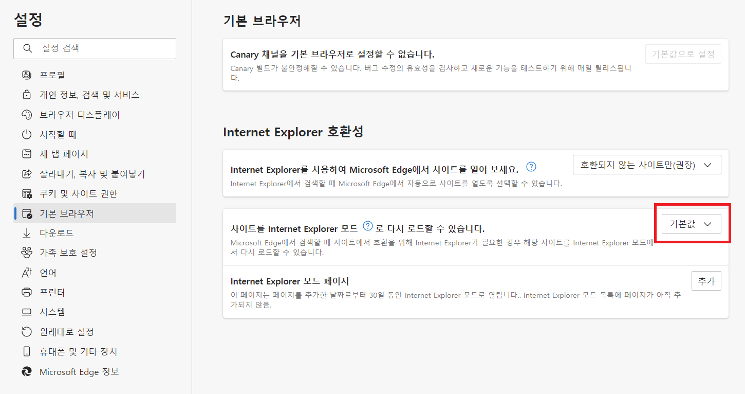 3. 기본 브라우저에 들어가서 '사이트를 Internet Explorer 모드로 다시 로드할 수 있습니다.' 의 설정값을 '허용' 으로 바꾸어준다.