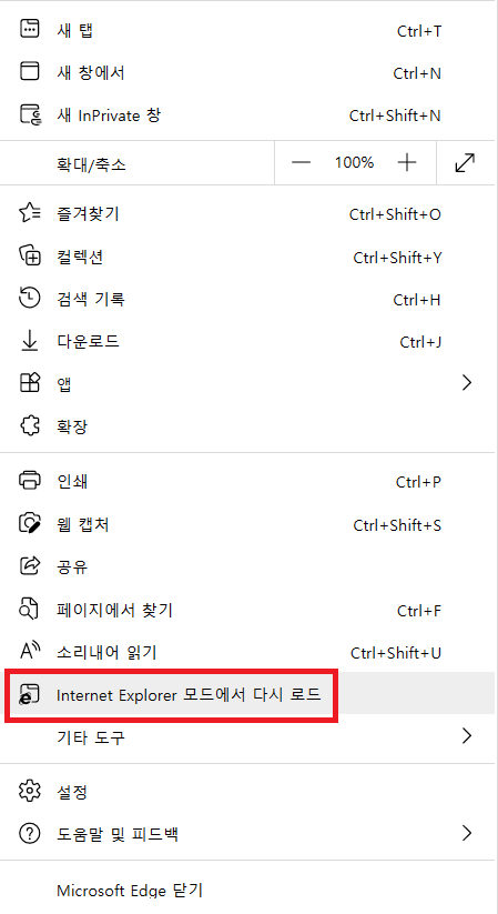 4. Internet Explorer 로 들어가고자 했던 사이트에 들어간 후 'Internet Explorer 모드에서 다시 로드' 버튼을 클릭한다.