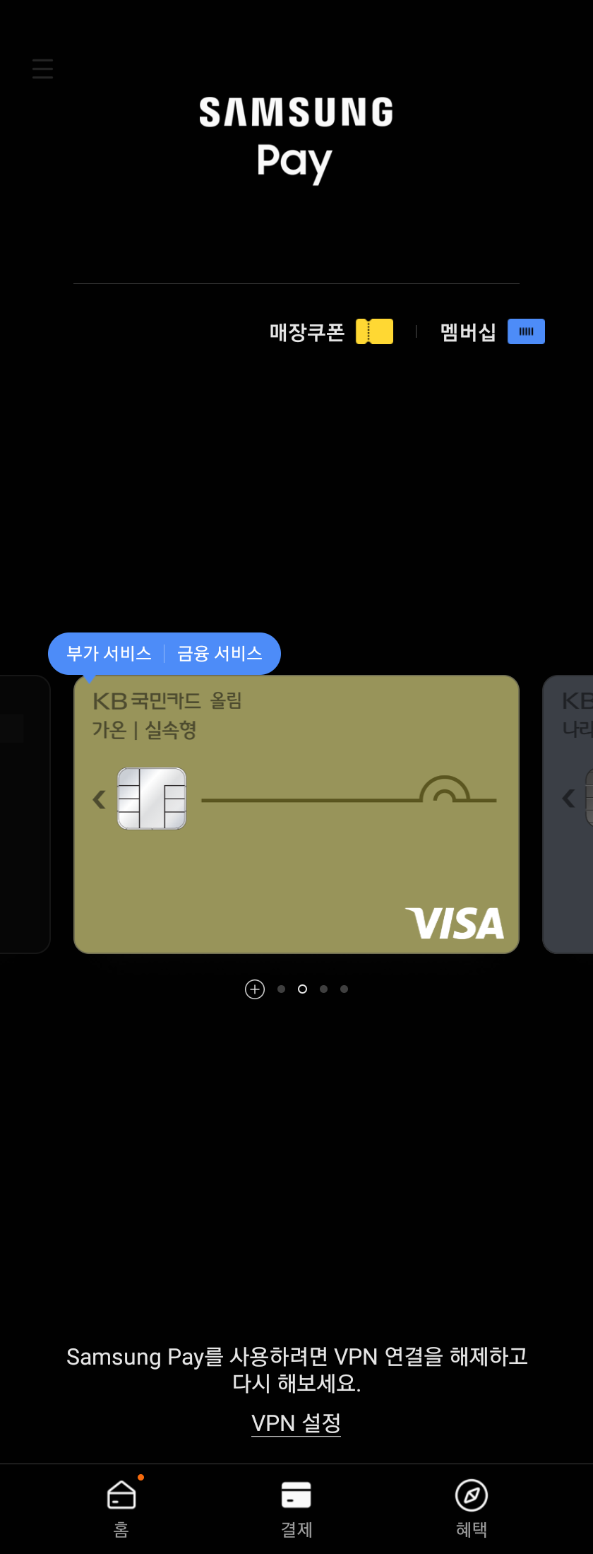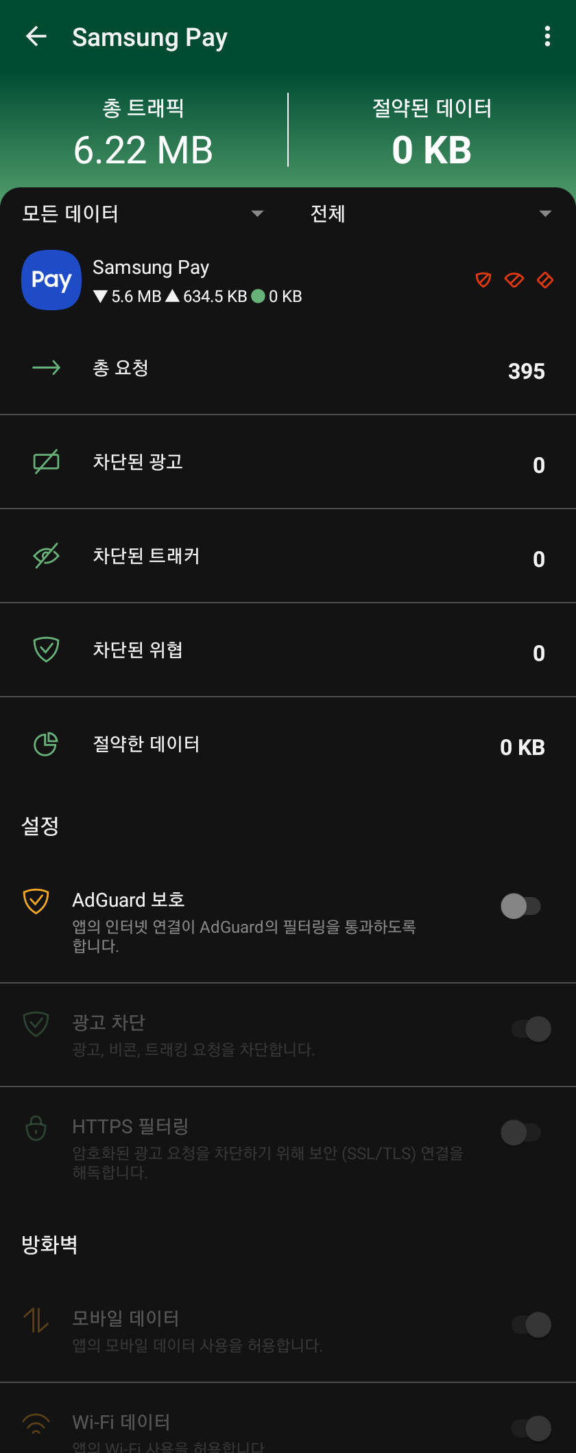 끝이다. 이렇게 되면 아래와 같이 애드가드가 실행된 상태에서도 삼성페이를 제대로 실행할 수 있다.