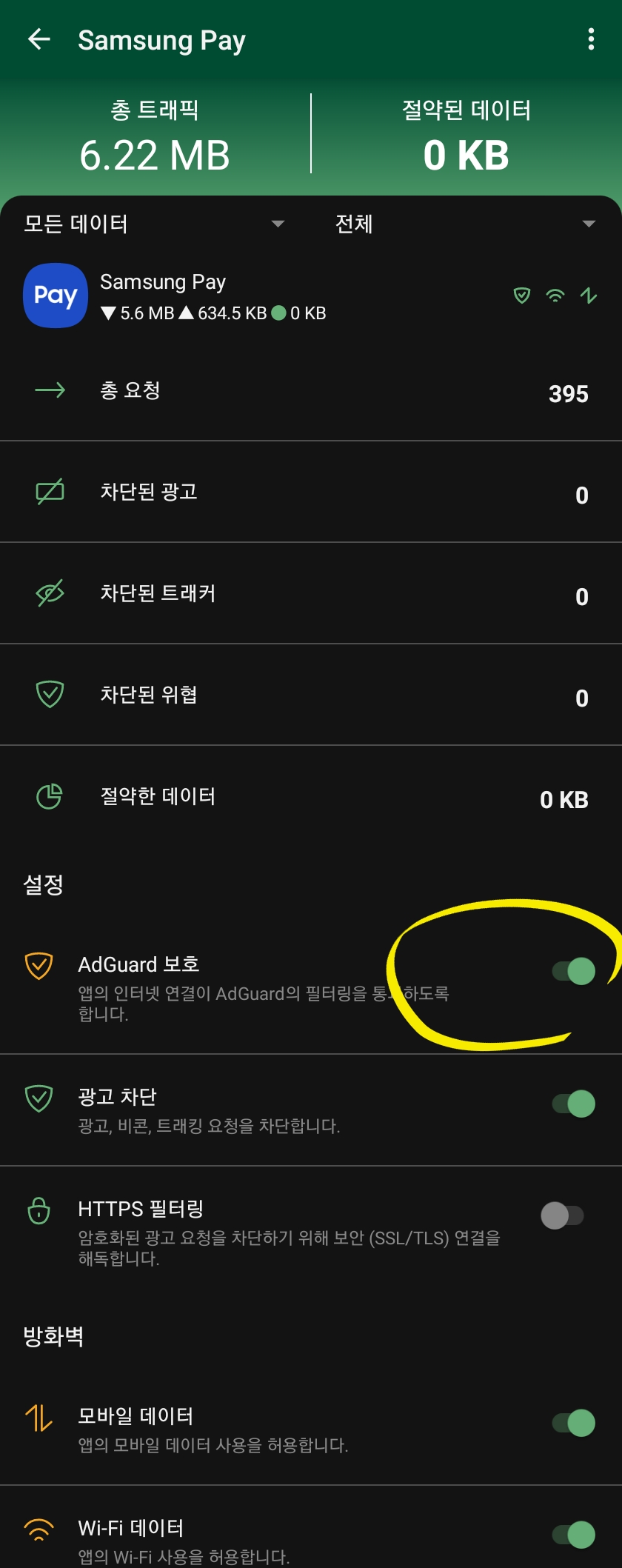애드가드를 처음 설치하거나 다른 기기로 바꾸면 겪는 답답한 점이 있다. 바로 삼성페이가 제대로 실행되지 않는다는 것이다. 매번 결제할 때마다 껐다 키기도 귀찮은데 이에 대한 해결법을 적는다.(광고차단을 하지 않을 모든 앱에 적용된다.)