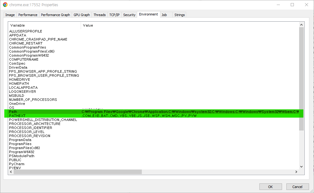 위 화면에서 'Environment'를 클릭하면 해당 프로세스가 실행되었을 때의 환경변수가 나온다.