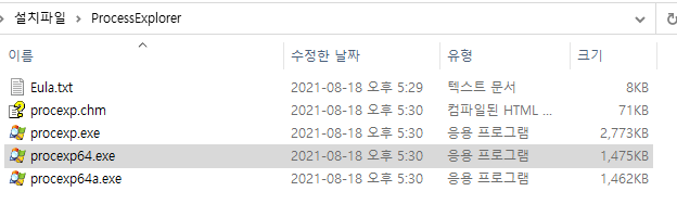 압축을 풀면 아래와 같은 프로그램이 보인다. procexp64.exe를 실행하면 된다.