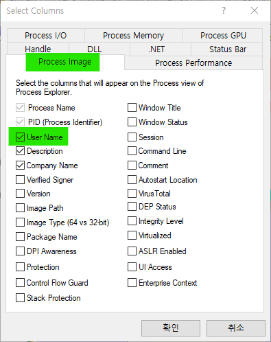 해당 프로세스를 실행한 사용자를 알고 싶으면 'Select Columns...'의 'Process Image'에서 'User Name'을 선택하면 실행한 사용자가 나온다.