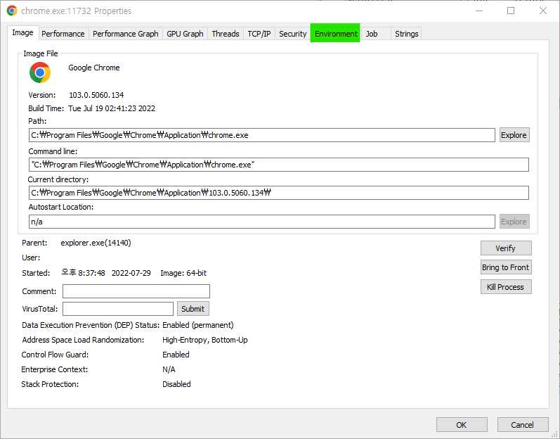 Process Explorer라는 프로그램은 프로세스에 대한 상세한 정보를 보여주는 프로그램이다. 이 프로그램은 프로세스가 실행되었을 시점의 환경변수도 보여준다. 환경변수는 프로세스가 실행될 때 호출되면 재실행 전까지 변경되지 않는다는 특성을 이용한 것이다. 해당 프로그램은 아래의 링크에서 받을 수 있다.